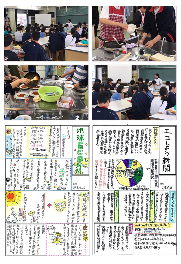 この授業を行ったことで、より具体的な省エネ行動を考えることができたように感じる。特にエコクッキングを実践することでもっとやってみたいと意識を高くもつ生徒も見られた。その後の調理実習においてもエコを意識した調理をする生徒の姿が見られた。ステップ3で新聞を作成することで、現在の課題は何か、自分はどんなことを取り組みたいと考えているのかを深く考えることができたようだ。